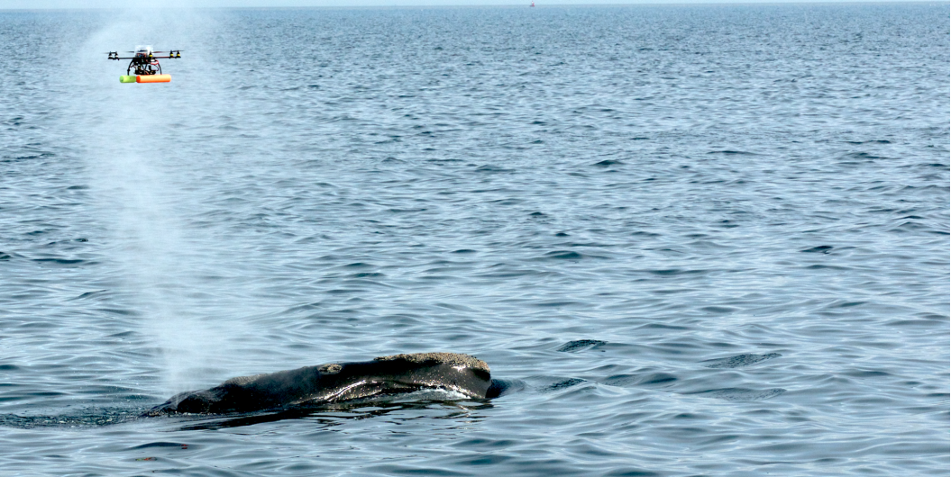 Drones bieden een stabiel, stil platform, waardoor stress en verstoring van de walvis tot een minimum worden beperkt. © NEAq/WHOI, NMFS/NOAA Permit #21371.