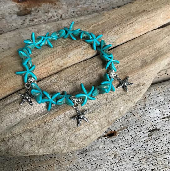 Super lief armbandje gemaakt van turquoise gekleurd howliet en zilveren zeesterren hangertjes op elastisch draad.